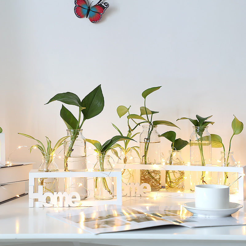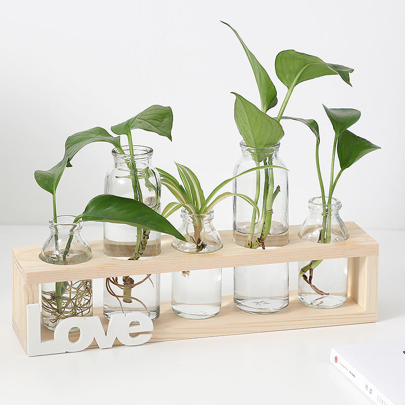 Ge ditt hem en naturlig och stilren känsla med dessa vackra glasvaser i träställ. Setet består av 3 eller fem glasvaser i olika storlekar, placerade i en stabil ram av ljust trä med den dekorativa texten Love framtill. Perfekt för sticklingar, små växter, snittblommor eller hydroponisk odling.