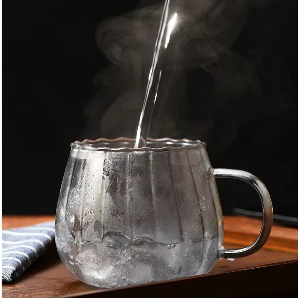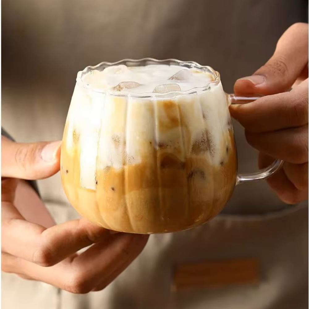 Dessa vackra glasmuggar kombinerar modern design med praktisk funktion. Den mjukt vågade ytan ger ett elegant uttryck och ett bekvämt grepp, medan det stabila handtaget gör muggen skön att hålla – perfekt för både varma och kalla drycker.